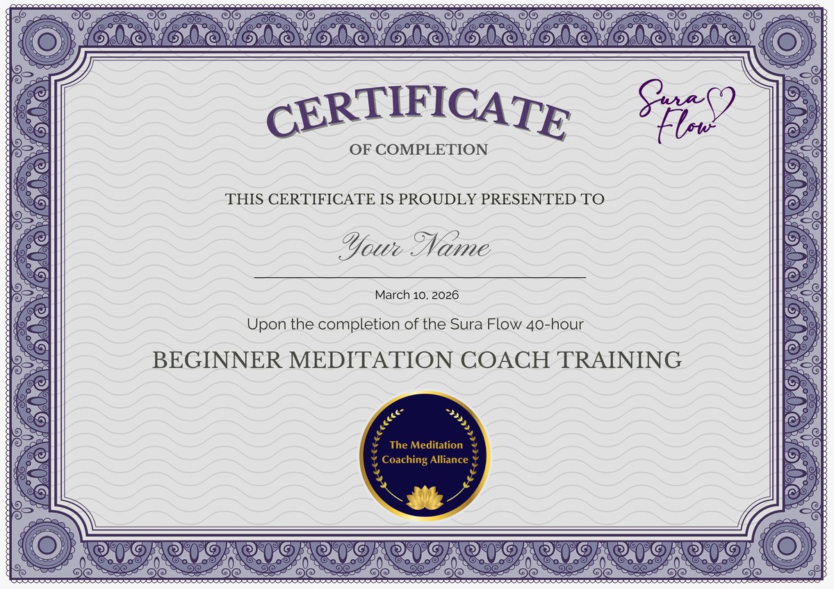 When you successfully complete all of the lessons, practices, and homework, you will receive a 40-hour training certificate. Certified and recognized through The Meditation Coaching Alliance.